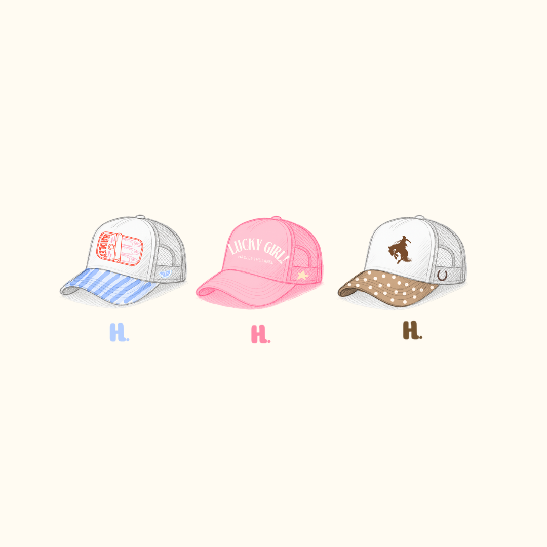 Each hat is completely custom, designed by me from the very first sketch. Think fun colors, bold patterns, an embroidered symbol on one side, and our Hadley “H” on the other. With custom boning and a Hadley tag inside, they’re as high-quality as they are cute!